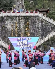 9月29日,承载千年苗族文明的重庆彭水蚩尤九黎城景区内,清风拂过吊脚楼檐,瑜伽爱好