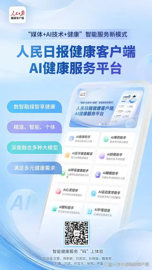 人民日报健康客户端AI健康服务平台入选2025“新闻+”创新案例 “人民日报健康客户端AI健康服务平台”通过人工智能技术,赋能媒体新质生产力,利用自然语言处理、深度学习、个性化推荐算法、语音合成等技术赋能平台数智化转型,将权威健康信息与大模型深度融合,创新打造“媒体+AI技术+健康”特色服务平台,为各年龄段人群提供精准、智能、个体的健康服务。
